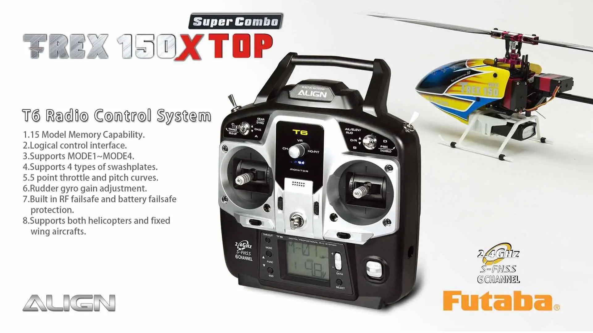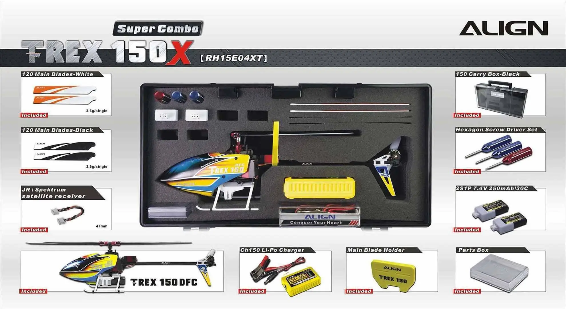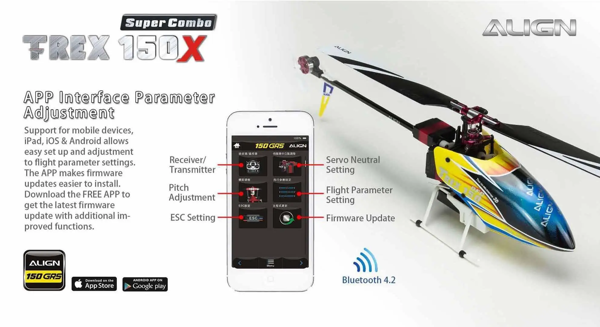 This T-REX 150X has been redesigned, fully assembled (BTF and RTF), mini size with the control feeling of a large size helicopter. This will allow you to enjoy flying in small areas. This new generation T-REX 150X is uniquely designed with high-end technology: BL Heli ESC program, Bluetooth function allow to change parameter settings via the FREE APP, Attitude mode for auto-level flight, Rescue mode for auto-level when heli is in trouble and six –axis gyro using a superior ARM Cortex-M4 32 bits processor, and more.Besides the new software enhancements, there are big improvements on the structure design, a brand new high rigidity main frame, metal CCPM swash-plate, and a standalone tail motor plug mount which allows easy maintenance. For ease of control the T-REX 150X is equipped with Attitude Mode and Rescue Mode. Enable Attitude - Self Leveling Mode to avoid flip overs during flight. Flip a switch and Rescue Mode takes over to keep the heli at a level position. These new features, and boost flying skills. Fly with Confidence! Thanks for Flying Align!