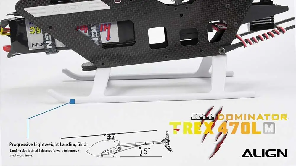 The 470EFL Main Rotor Head provides superior flight stability and offers a lower CG design to reduce flying resistance while providing a more rigid and fast rotor head response. To improve the strength and durability of the main and feathering shaft the 470 main shaft outer dimension was increased from 5mm to 6mm, while the feathering shaft outer dimension was increased from 4mm to 5mm. The ALIGN 470LM adopts a high quality 1.2mm 3K carbon fiber main frame and a wider body design which increases the size of the battery compartment allowing the use of larger capacity battery. The 470L utilizes a high efficient belt drive assembly design with an innovative adjustable belt guide pulley, providing a convenient way to adjust the belt tension by releasing or tightening the screw. This screw is used to maintain optimal belt tension improving the life of the belt and lowering maintains costs. The landing skid is tilted 5 degrees forward to improve crashworthiness and makes TREX 470L more avant-garde and dynamic.