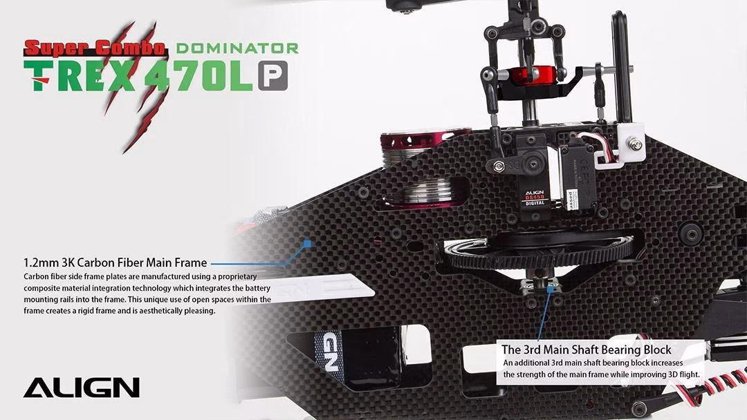 The 470EFL Main Rotor Head provides superior flight stability and offers a lower CG design to reduce flying resistance while providing a more rigid and fast rotor head response. To improve the strength and durability of the main and feathering shaft the 470 main shaft outer dimension was increased from 5mm to 6mm, while the feathering shaft outer dimension was increased from 4mm to 5mm. The 470LP adopts a high standard 1.2mm 3K carbon fiber main frame and a wider body design which increases the size of the battery compartment allowing the use of larger capacity battery. The ALIGN 470LP utilizes a high efficient belt drive assembly design with an innovative adjustable belt guide pulley, providing a convenient way to adjust the belt tension by releasing or tightening the screw. This screw is used to maintain optimal belt tension improving the life of the belt and lowering maintains costs. The landing skid is tilted 5 degrees forward to improve crashworthiness and makes TREX 470LP more avant-garde and dynamic.
