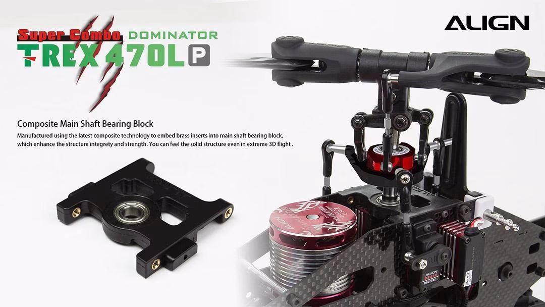 Manufactured using the latest composite technology to embed brass inserts into main shaft bearing block, which enhance the structural integrity and strength. You can feel the solid structure even in extreme 3D flight.