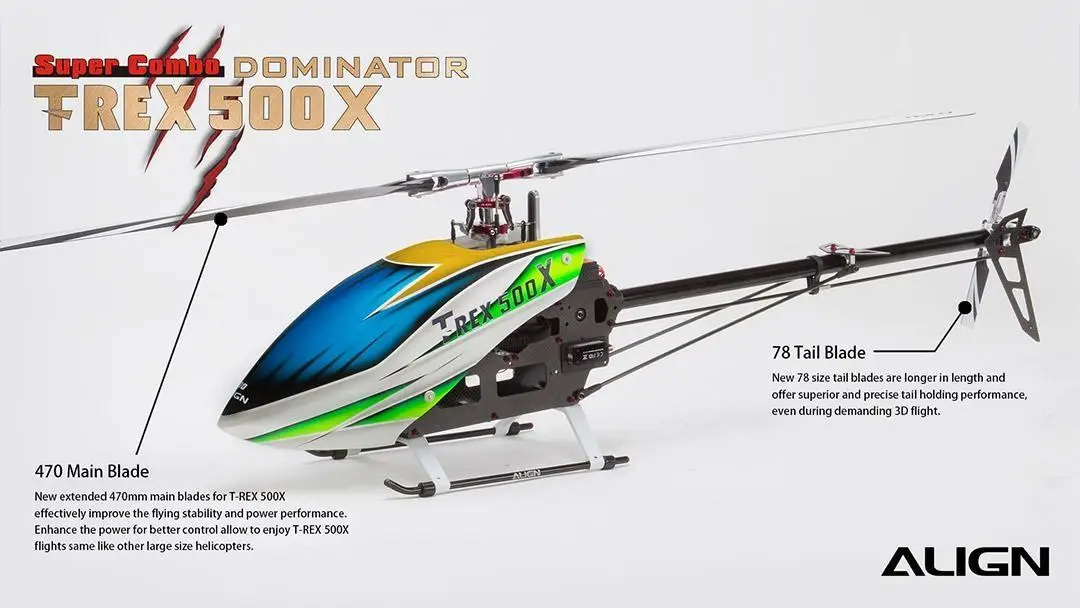 New extended 470mm main blades for T-REX 500X effectively improve the flying stability and power performance. Enhance the power for better control allow to enjoy T-REX 500X flights same like other large size helicopters. New 78 size tail blades are longer in length and offer superior and precise tail holding performance, even during demanding 3D flight.