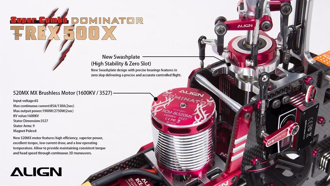 T-REX 500X utilizes 470mm main blades and 520MX(1600KV/3527) motor with 20% power upgrades than the original 1600KV/3225 motor. The latest new RCE-BL80X Brushless ESC support dual BEC output from 6 ~ 8.4V providing efficient and superior power. The NEW DS530M/DS535M digital servos are with extreme torque and speed response allow to support faster, more precise and accurate flight performance.