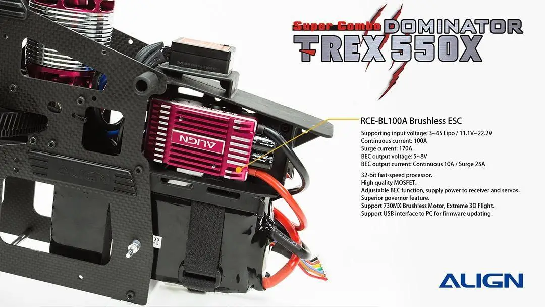 The TREX 550X utilizes the powerful 730MX (960KV) motor and our RCE-BL100A Brushless ESC which both are highly efficient providing superior power, improving the performance of the 6S power system. The NEW DS820M/DS825M high voltage brushless servos are extremely efficient and out perform other servos in this class. To protect these servos the new high-end CNC aluminum case function as a heat sink allowing the servos to operate at a lower temperature.
