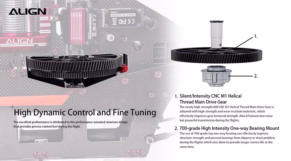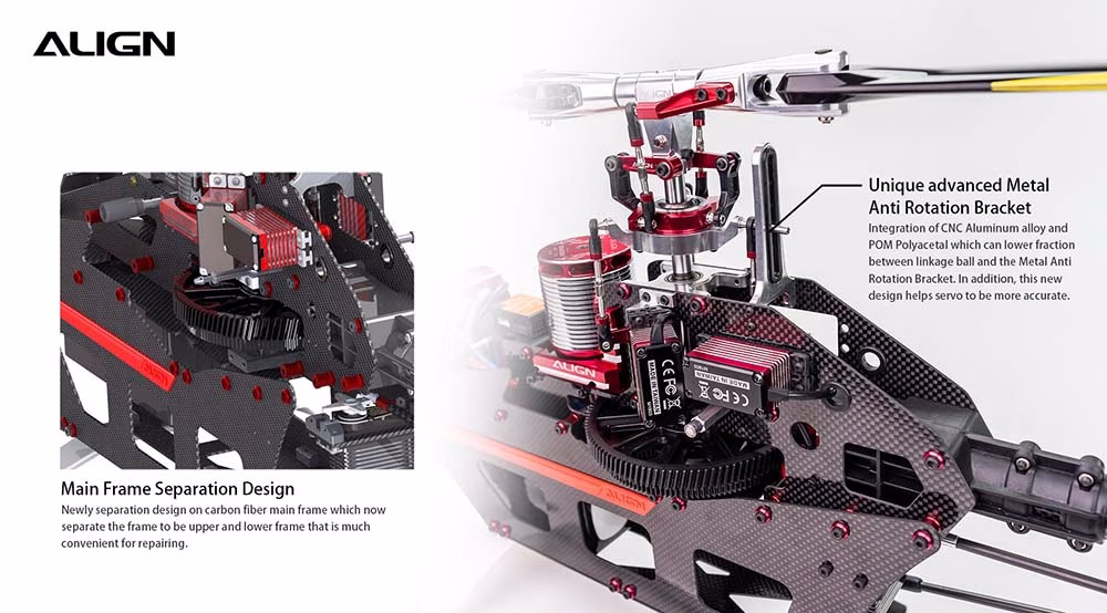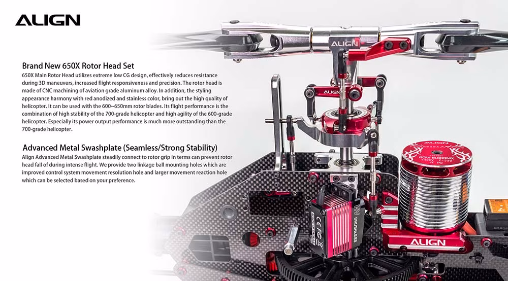 T-REX 650X has an ALIGN 800MX (720KV) motor with excellent torque and high efficiency. Besides, the reinforcement plate can strengthen frame structure and efficiently lower motor heat up to 20°C on every flight on average. The brushless RCE-BL130A ESC supports 6S 5200~6000mAh battery input. Pilots can choose main blades from 600~650mm based on their preference for outstanding flight performance.
