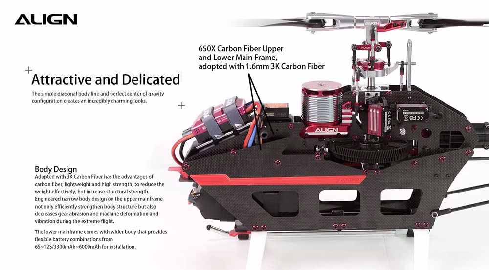 “T-REX 650X F3C” is a special design for hobby use and competition. T-REX 650X body size is between T-REX 600 and T-REX 700 class size helicopter. It adopts integrated composite material and technology that efficiently enhances structure intensity and makes repair convenient. The upper narrow main frame strengthens the structure but also prevents the body from deformation, vibration, and gear abrasion in extreme flights. The lower, wider main frame is designed with a quick-release latch for battery insertion and removal convenience and safety. The flybarless rotor head is a low CG design better for F3C flight, allowing for wind resistance reduction and improving superior flying feel and stability.