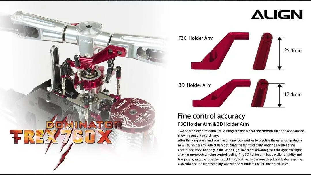 Two new holder arms with CNC cutting provide a neat and smooth lines and appearance, showing out of the ordinary. After thinking again and again and numerous washes to practice the essence, gestate a new F3C holder arm, effectively doubling the flight stability, and the excellent fine control accuracy; not only in the static flight has more advantages in the dynamic flight also has more outstanding control feeling. The 3D holder arm has excellent rigidity and toughness, suitable for extreme 3D flight, features with more direct and faster response, also enhance the flight stability, allowing to stimulate the infinite possibilities.