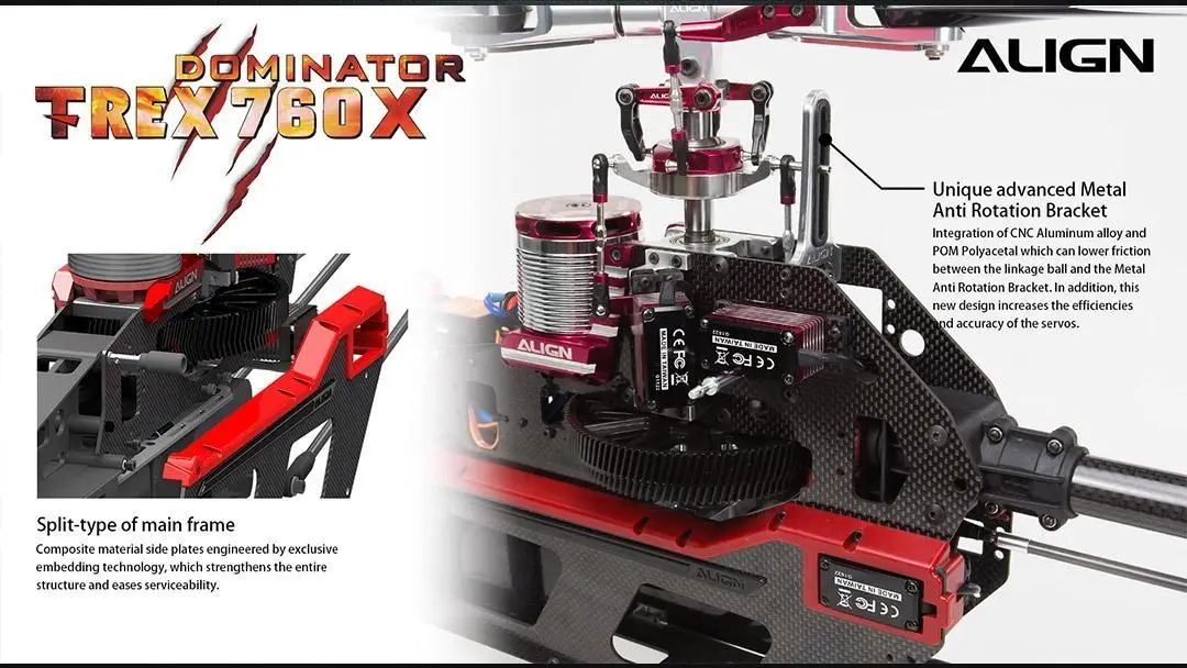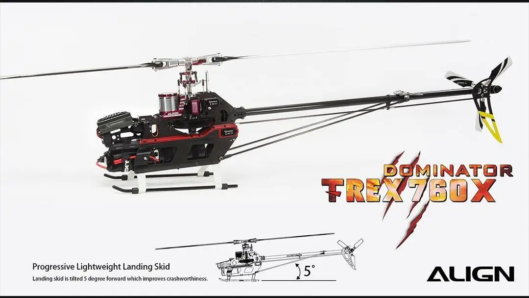 The ALIGN TREX 760X Top Combo introduces an advanced engineered narrow body design efficiently decreases gear abrasion, machine deformation, increases power, and extends flying durability. The unique Split-Type Main Frame design, made of composite material side plates, is engineered using our proprietary embedding technology, which strengthens the entire structure and provides better accessibility for servicing the ALIGN 760X. This extraordinary design includes a progressive lightweight landing skid making the T-REX 760X the leader in this class. The lightweight structure design which significantly reduce the body weight can effectively increase your flight time.