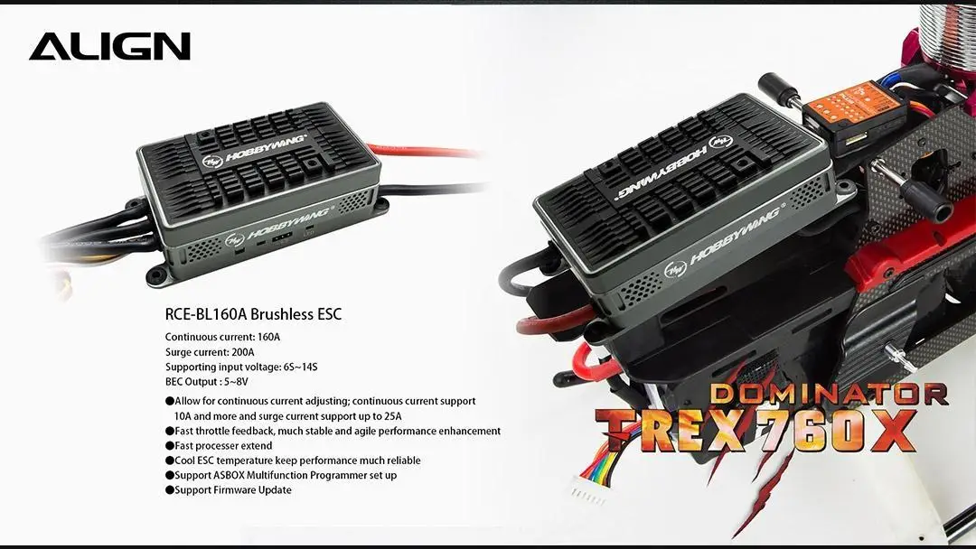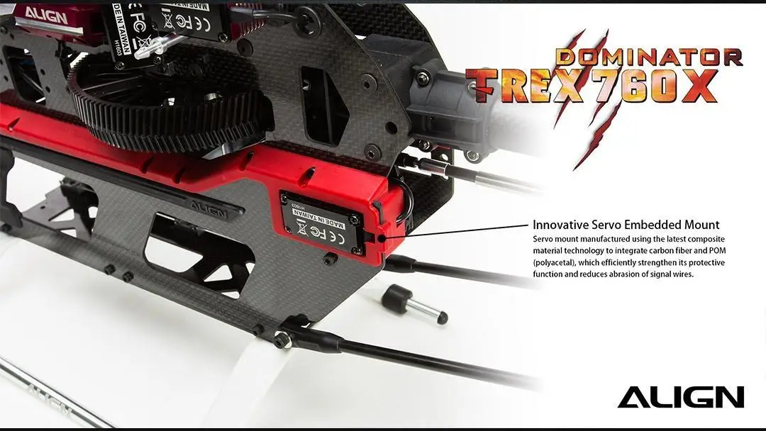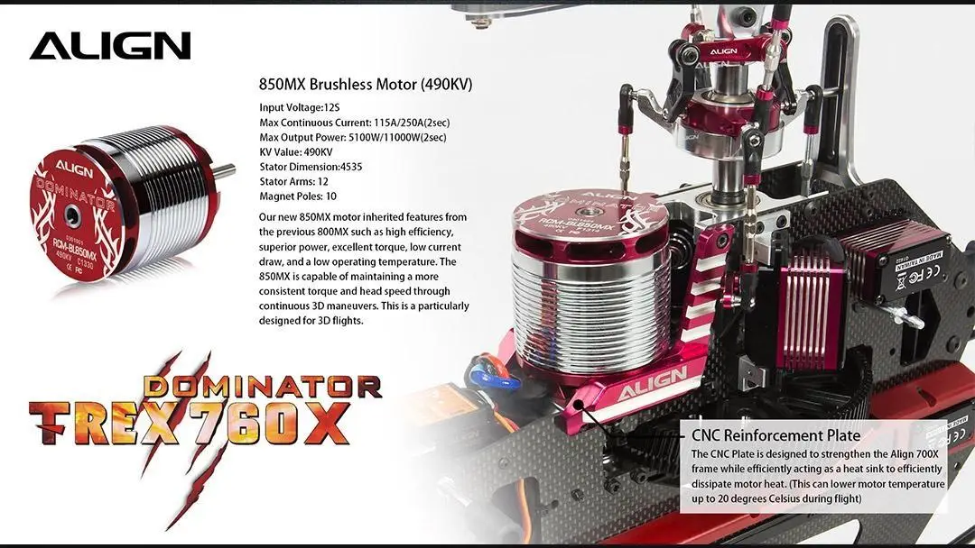 The TREX 760X is equipped with the new 850MX motor which is highly efficient with superior power, excellent torque, low current draw, and is the most advanced motor approved by World RC Champions. The new designed motor cooling mount plate can reduce the motor operating temperature up to 20°C (68°F). The helicopter’s high quality design is accented with precision machined red and silver metal parts. The brand new Platinum HV 160A V4 ESC supplies extreme power. The ESC includes a superior governor and BEC. The NEW DS820M/DS825M high voltage brushless servos are more efficient and outperform other servos in this class. To protect these servos the new high-end CNC aluminum case function as a heat sink allowing the servos to operate at a lower temperature.