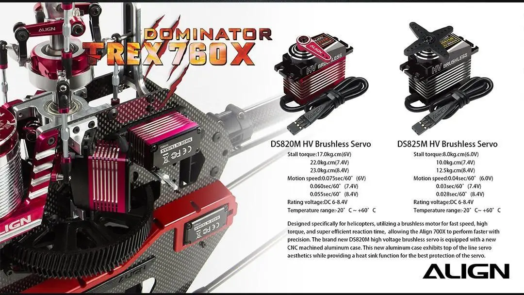 Designed specifically for helicopters, utilizing a brushless motor for fast speed, high torque, and super efficient reaction time, allowing the Align 700X to perform faster with precision. The brand new DS820M high voltage brushless servo is equipped with a new CNC machined aluminum case. This new aluminum case exhibits top of the line servo aesthetics while providing a heat sink function for the best protection of the servo.