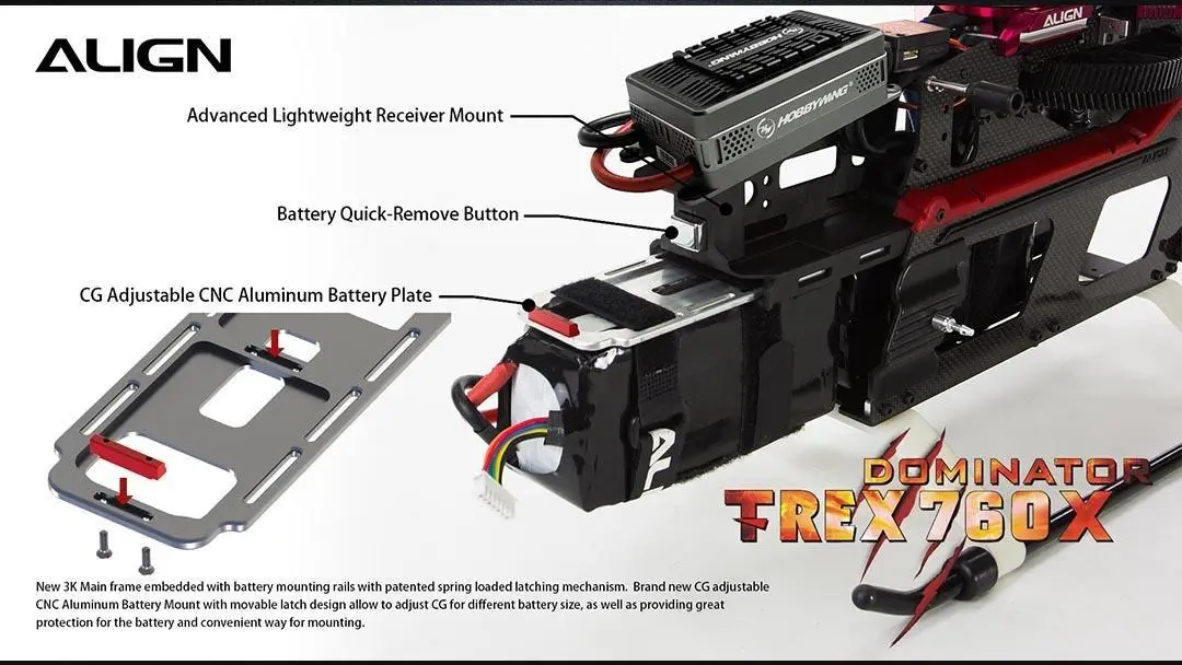New 3K Main frame embedded with battery mounting rails with patented spring loaded latching mechanism. Brand new CG adjustable CNC Aluminum Battery Mount with movable latch design allow to adjust CG for different battery size, as well as providing great protection for the battery and convenient way for mounting.