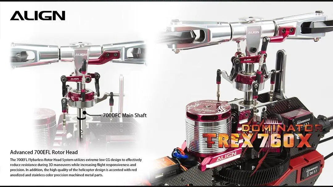 The 700EFL Flybarless Rotor Head System utilizes extreme low CG design to effectively reduce resistance during 3D maneuvers while increasing flight responsiveness and precision. In addition, the high quality of the helicopter design is accented with red anodized and stainless color precision machined metal parts.