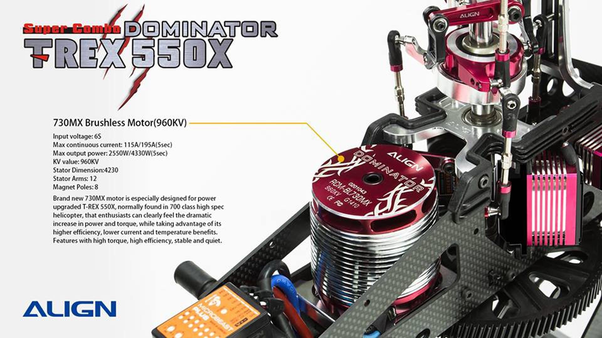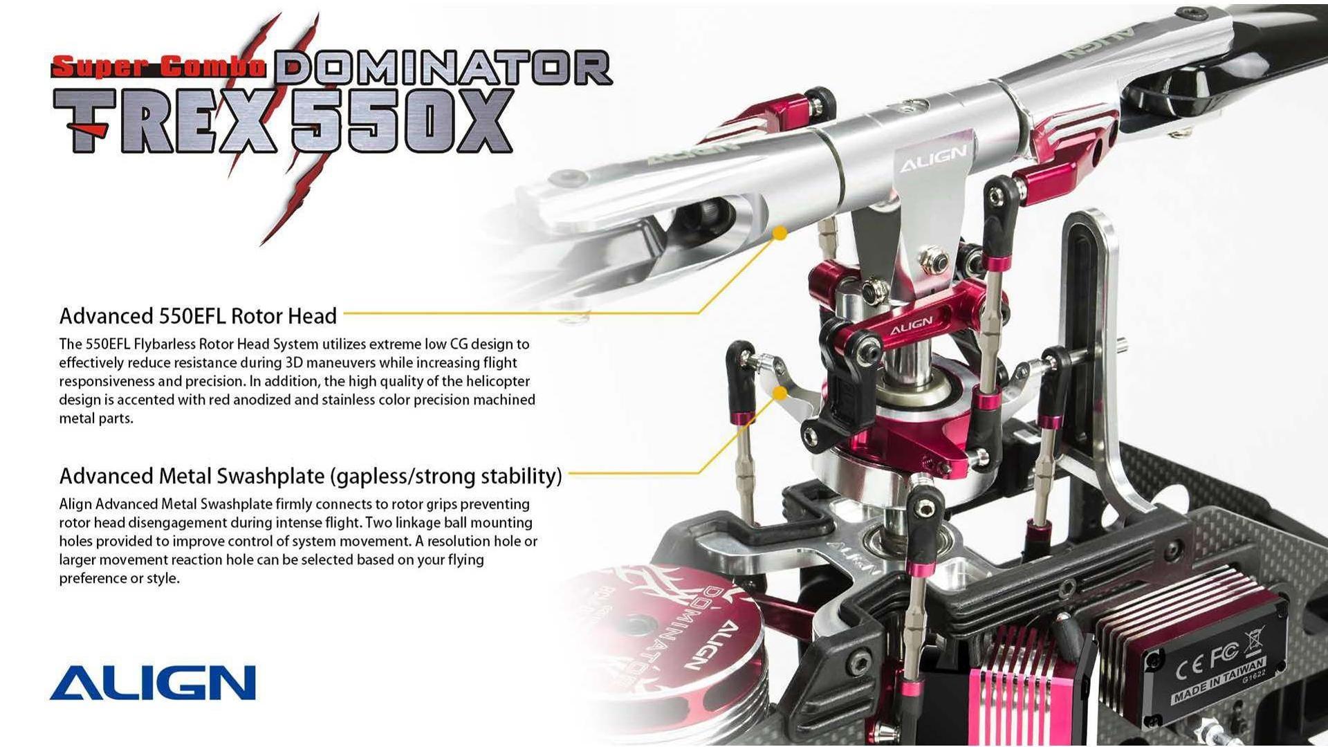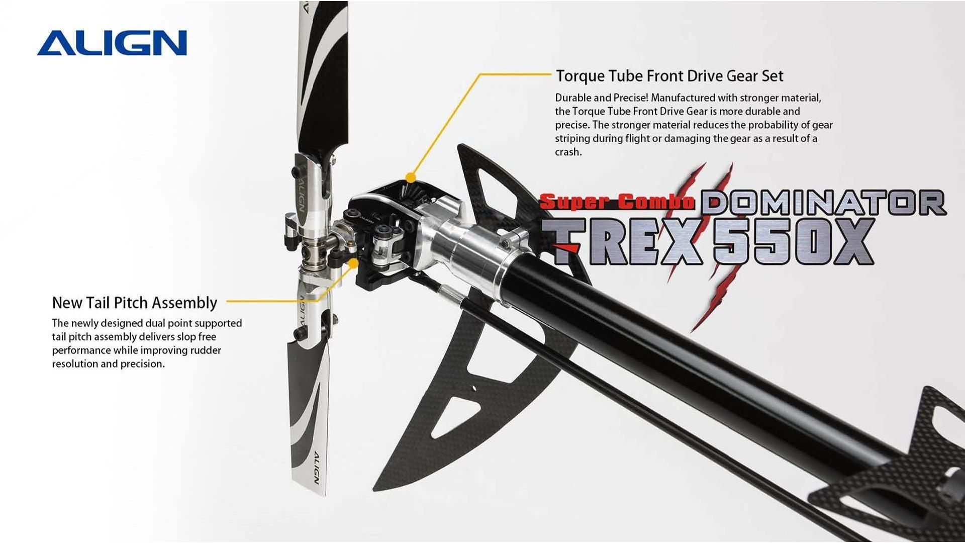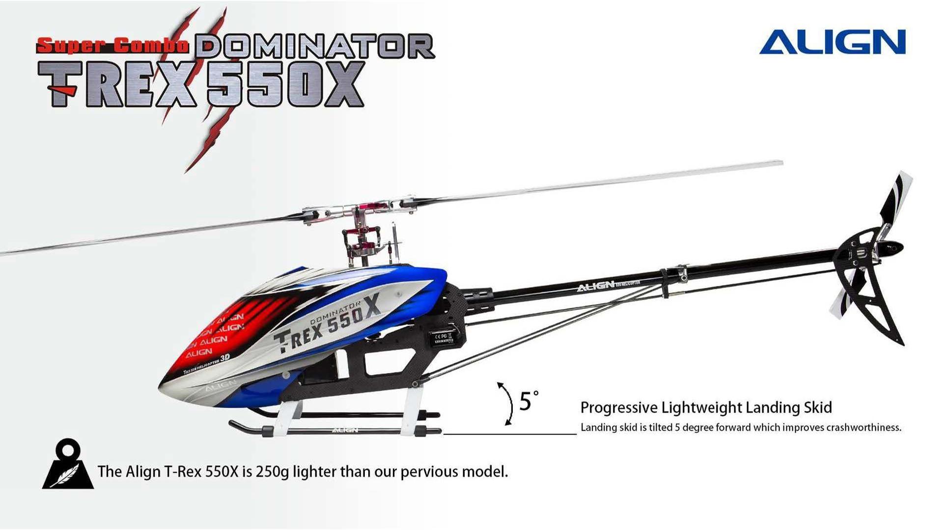 The NEW TREX 550X Dominator SUPER COMBO Kit is expected to be Release Soon! There are several upgrades to this new release by Align; including HV Servos, Skid Design, 100A Brushless ESC, 730MX Motor, Tail Pitch Assembly, and more. Another Good Release by Align!