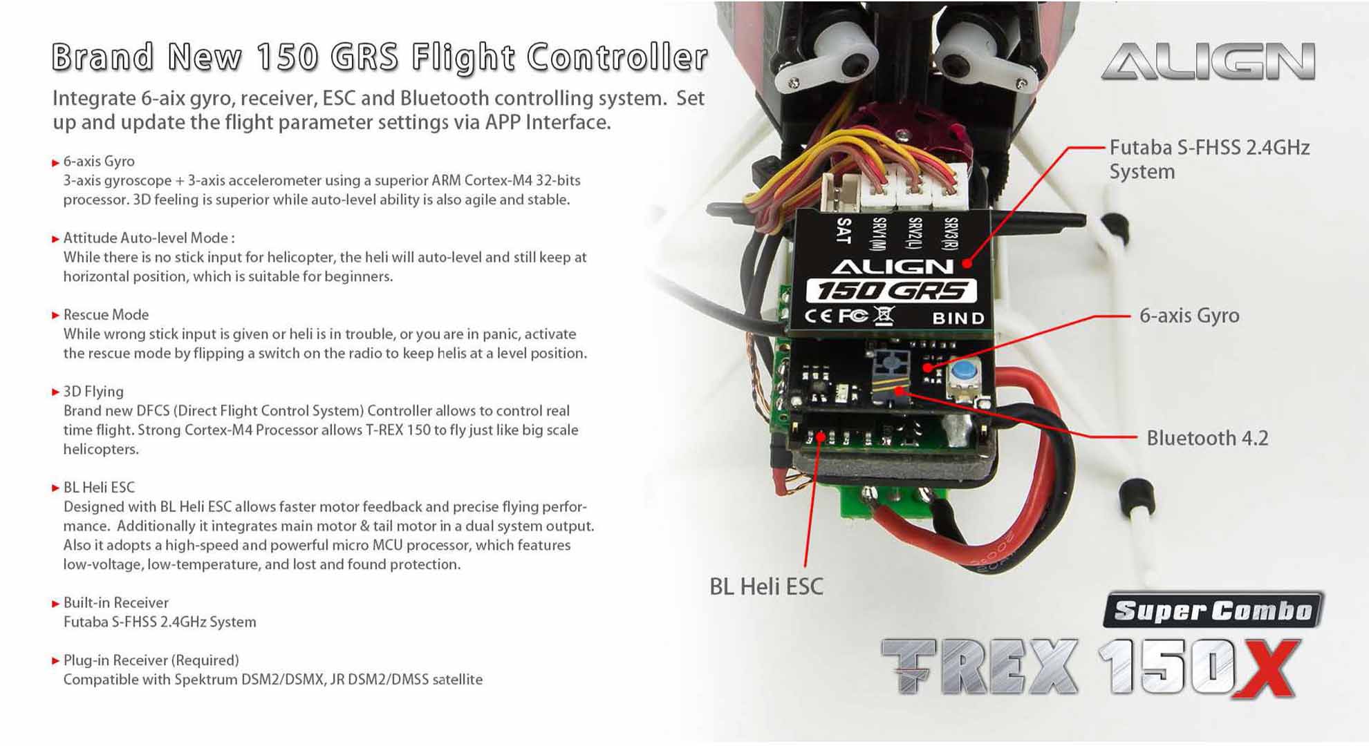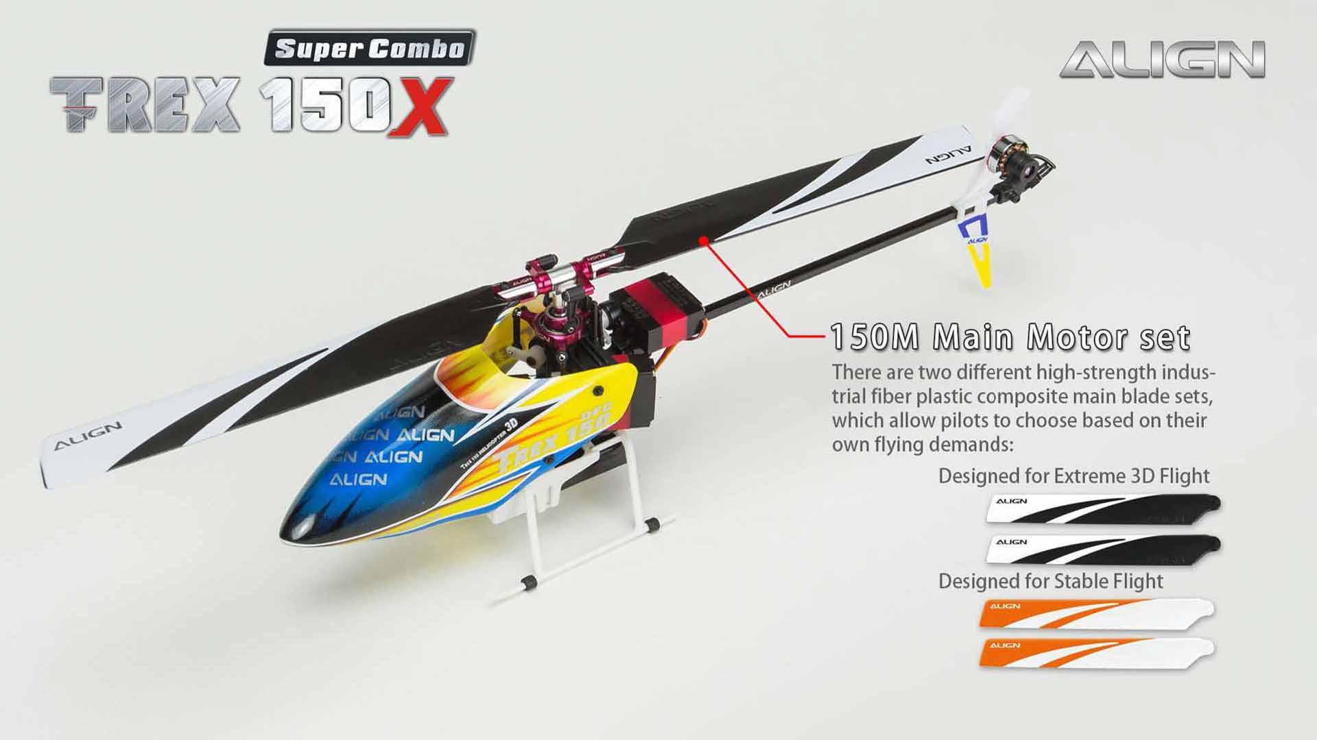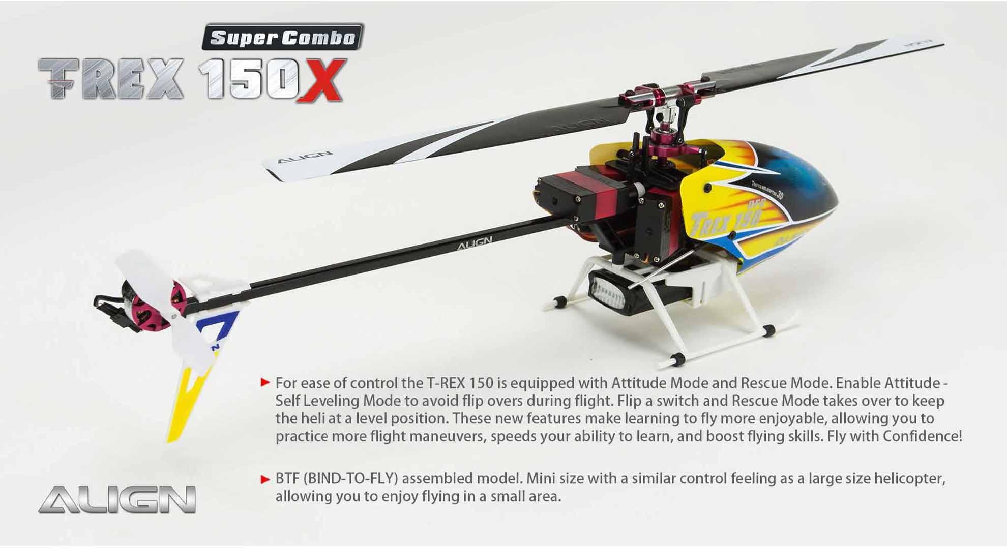 This T-REX 150X has been redesigned, fully assembled (BTF and RTF), mini size with the control feeling of a large size helicopter. This will allow you to enjoy flying in small areas. This new generation T-REX 150X is uniquely designed with high-end technology: BL Heli ESC program, Bluetooth function allow to change parameter settings via the FREE APP, Attitude mode for auto-level flight, Rescue mode for auto-level when heli is in trouble and six –axis gyro using a superior ARM Cortex-M4 32 bits processor, and more.Besides the new software enhancements, there are big improvements on the structure design, a brand new high rigidity main frame, metal CCPM swash-plate, and a standalone tail motor plug mount which allows easy maintenance. For ease of control the T-REX 150X is equipped with Attitude Mode and Rescue Mode. Enable Attitude - Self Leveling Mode to avoid flip overs during flight. Flip a switch and Rescue Mode takes over to keep the heli at a level position. These new features, and boost flying skills. Fly with Confidence! Thanks for Flying Align!