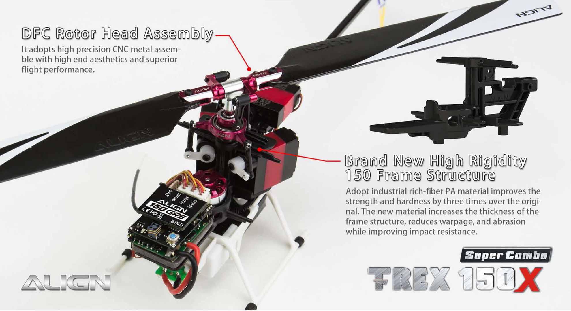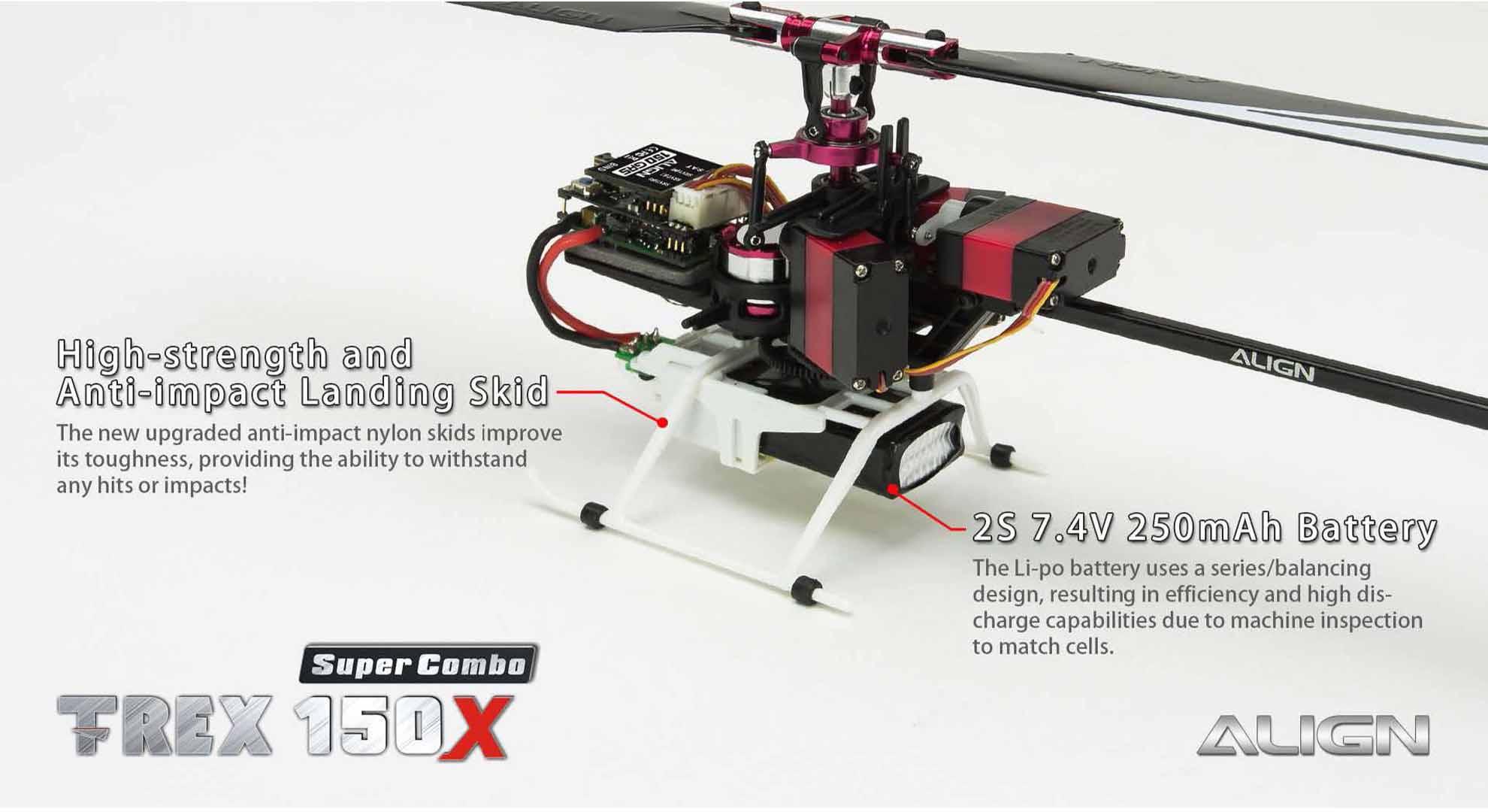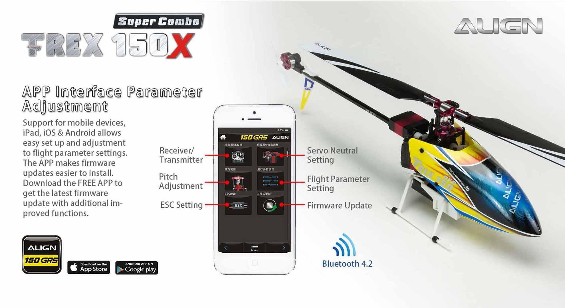 This T-REX 150X has been redesigned, fully assembled (BTF and RTF), mini size with the control feeling of a large size helicopter. This will allow you to enjoy flying in small areas. This new generation T-REX 150X is uniquely designed with high-end technology: BL Heli ESC program, Bluetooth function allow to change parameter settings via the FREE APP, Attitude mode for auto-level flight, Rescue mode for auto-level when heli is in trouble and six –axis gyro using a superior ARM Cortex-M4 32 bits processor, and more.Besides the new software enhancements, there are big improvements on the structure design, a brand new high rigidity main frame, metal CCPM swash-plate, and a standalone tail motor plug mount which allows easy maintenance. For ease of control the T-REX 150X is equipped with Attitude Mode and Rescue Mode. Enable Attitude - Self Leveling Mode to avoid flip overs during flight. Flip a switch and Rescue Mode takes over to keep the heli at a level position. These new features, and boost flying skills. Fly with Confidence! Thanks for Flying Align!