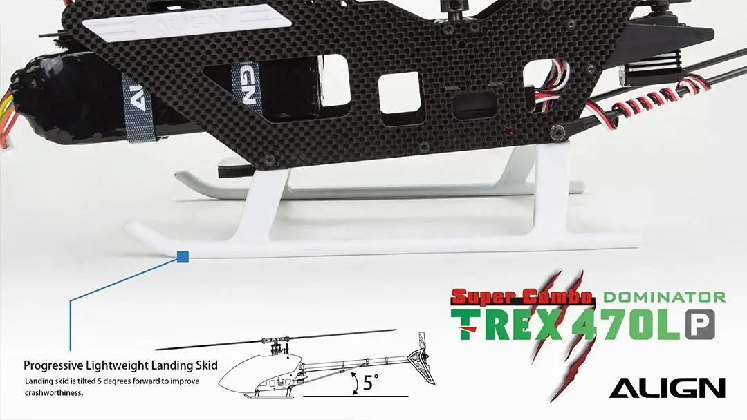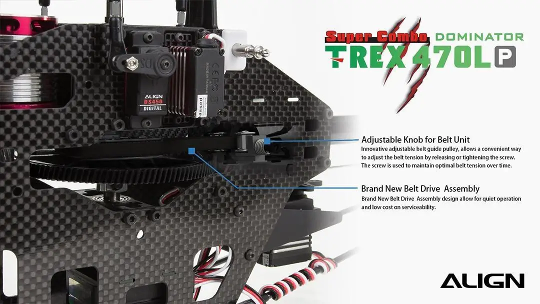 The 470EFL Main Rotor Head provides superior flight stability and offers a lower CG design to reduce flying resistance while providing a more rigid and fast rotor head response. To improve the strength and durability of the main and feathering shaft the 470 main shaft outer dimension was increased from 5mm to 6mm, while the feathering shaft outer dimension was increased from 4mm to 5mm. The 470LP adopts a high standard 1.2mm 3K carbon fiber main frame and a wider body design which increases the size of the battery compartment allowing the use of larger capacity battery. The ALIGN 470LP utilizes a high efficient belt drive assembly design with an innovative adjustable belt guide pulley, providing a convenient way to adjust the belt tension by releasing or tightening the screw. This screw is used to maintain optimal belt tension improving the life of the belt and lowering maintains costs. The landing skid is tilted 5 degrees forward to improve crashworthiness and makes TREX 470LP more avant-garde and dynamic.