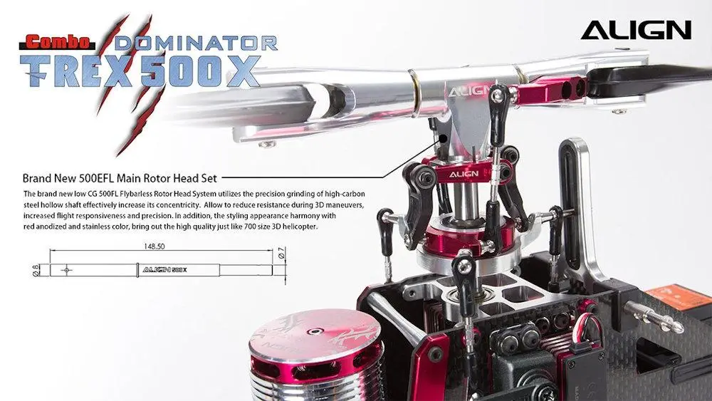 The brand new low CG 500FL Flybarless Rotor Head System utilizes the precision grinding of high-carbon steel hollow shaft effectively increase its concentricity. Allow to reduce resistance during 3D maneuvers, increased flight responsiveness and precision. In addition, the styling appearance harmony with red anodized and stainless color, bring out the high quality just like 700 size 3D helicopter.