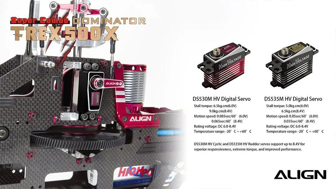 T-REX 500X utilizes 470mm main blades and 520MX(1600KV/3527) motor with 20% power upgrades than the original 1600KV/3225 motor. The latest new RCE-BL80X Brushless ESC support dual BEC output from 6 ~ 8.4V providing efficient and superior power. The NEW DS530M/DS535M digital servos are with extreme torque and speed response allow to support faster, more precise and accurate flight performance.
