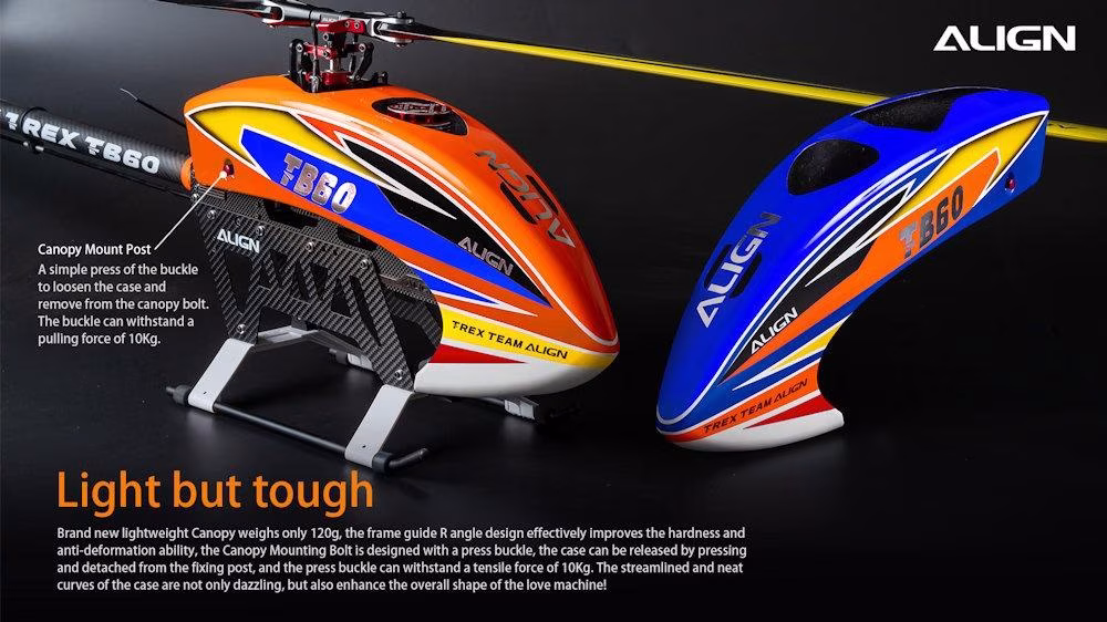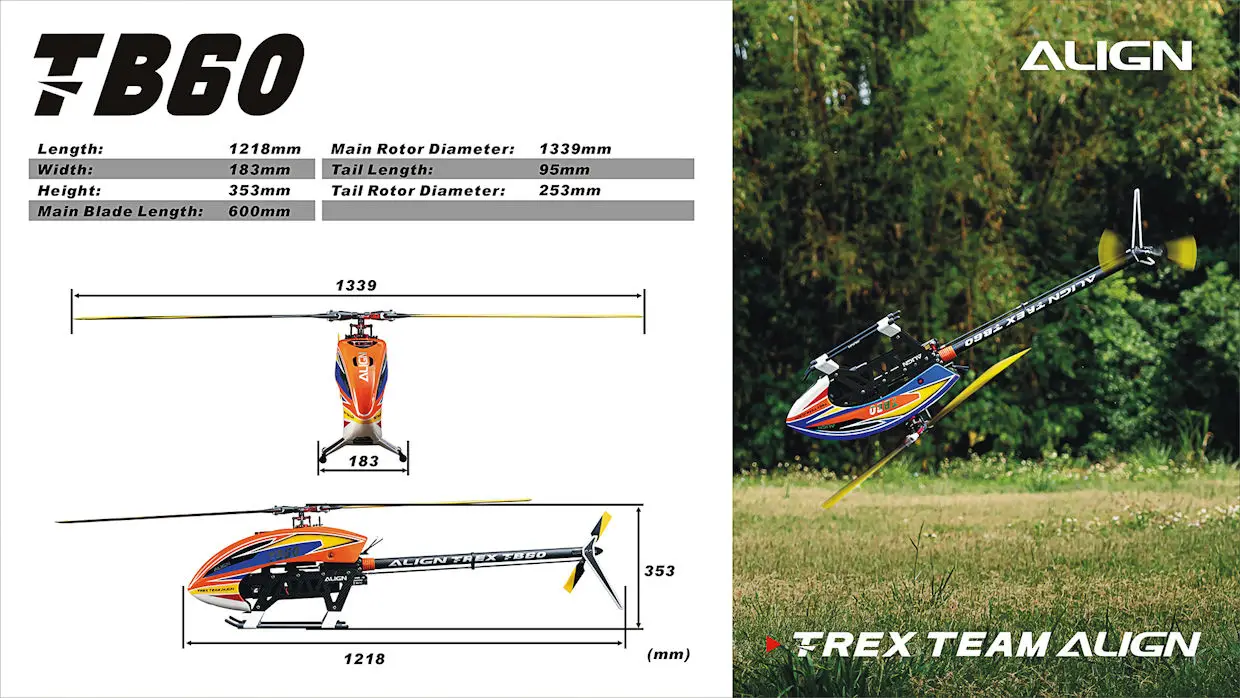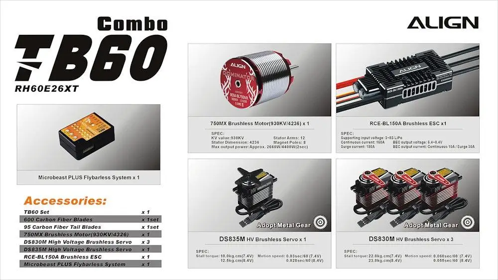 All-New ALIGN T-REX TB60 Top Combo RH60E26XW is specially designed for basic flight and those extreme 3D flight addicts. Where do you rate your flight skills or strive to be? Many people confuse Basic, Scale, and 3D flight. When in reality the difference is flight skills based on orientation, practice, and speed of sick movement. Begin your adventure today!