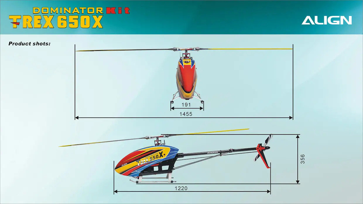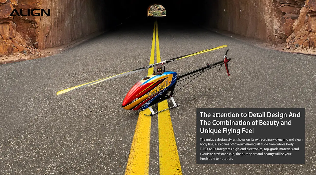 “T-REX 650X Dominator Kit” is a special design for hobby use and 3D competition. T-REX 650X body size is between T-REX 600 and T-REX 700 class size helicopter. It adopts integrated composite material and technology that efficiently enhances structure intensity and repair convenience. The upper narrow main frame allows the strengthening of the structure but also prevents the body from deformation, vibration, and gear abrasion in extreme flights. The lower, wider main frame is designed with a quick-release latch for a battery that makes battery insertion and removal more convenient and safer. The flybarless rotor head is a low CG design that is better for 3D flight, reduces wind resistance, and improves superior flying feel and stability. The ALIGN T-REX 650X exhibits excellent performance in both 3D aggressive, slow 3D, and F3C flights!