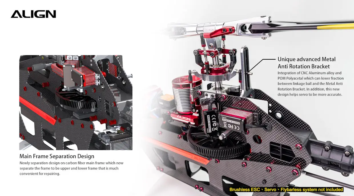 T-REX 650X has an ALIGN 800MX motor with excellent torque and high efficiency. Besides, the reinforcement plate can not only strengthen machine structure but also can efficiently lower motor heat up to 20°C on every flight on average. Pilots can choose main blades from 600~650mm based on their preference for outstanding flight performance.
