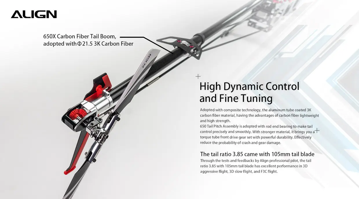 “T-REX 650X Dominator Super Combo” is a special design for hobby use and 3D competition. T-REX 650X body size is between T-REX 600 and T-REX 700 class size helicopter. It adopts integrated composite material and technology that efficiently enhances structure intensity and repair convenience. The upper narrow main frame allows the strengthening of the structure but also prevents the body from deformation, vibration, and gear abrasion in extreme flights. The lower, wider main frame is designed with a quick-release latch for a battery that makes battery insertion and removal more convenient and safer. The flybarless rotor head is a low CG design that is better for 3D flight, reduces wind resistance, and improves superior flying feel and stability. The ALIGN T-REX 650X exhibits excellent performance in both 3D aggressive, slow 3D, and F3C flights!