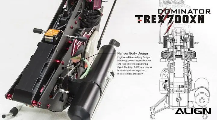 T-REX 700XN adopts the new direct to swashplate servo design, compared to the previous generation T-REX 700N’s push-pull mode control, provides precise and fast control! Utilizing the 700X Flybarless Rotor Head System features an extremely low Center of Gravity (CG) design, to effectively reduces resistance during 3D maneuvers, and increase flight responsiveness and precision. This designed maintains a 90-degree symmetrical angle between the Rotor Grip Arms and Linkage Rods for superior stable flight performance. The Engineered Narrow Body Design efficiently decrease gear abrasion and frame deformation during flight. The T-REX 700XN maintains the proper CG, by moving the engine forward to allow the fuel tank to be positioned in the center of the main shaft. CG remains consistent as the fuel level changes during flight.