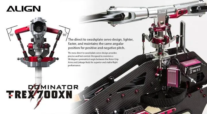 The new high voltage output: 6A 7.4V BEC with down / regulation system for constant power to the CCPM server channel for receivers and servos. Includes a built-in one-button push glow plug igniter eliminating the hassle of using traditional electric clip plug on igniters. Also increased external high-frequency filter capacitance to effectively reduce the interference generated by external noise; such as high-speed and high torque servos. The brand new DS820M/DS825M high voltage brushless servos use brushless motors for fast speed, high torque, superior, and efficient reaction time allows the Align 700XN precise, fast performance. The new CNC machined aluminum case design is aesthetically appealing while acting as a highly efficient heat sink.
