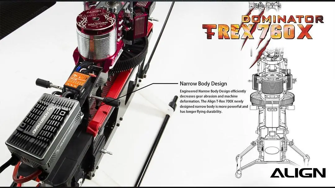 Engineered Narrow Body Design efficiently decreases gear abrasion and machine deformation. The Align T-Rex 700X newly designed narrow body is more powerful and has longer flying durability.